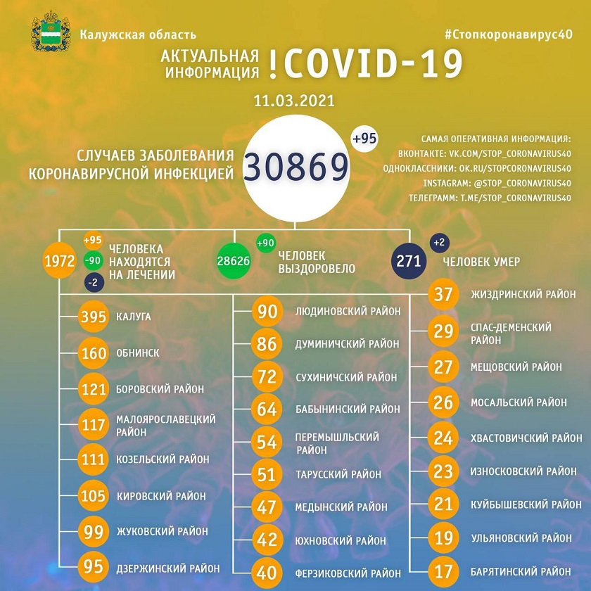 Также в сообщении названо новое количество заражённых. Так, по данным оперштаба в Калужской области 30 869 подтверждённых случаев заболевания коронавирусной инфекцией. Из них за последние сутки 95 выявленных пациентов.