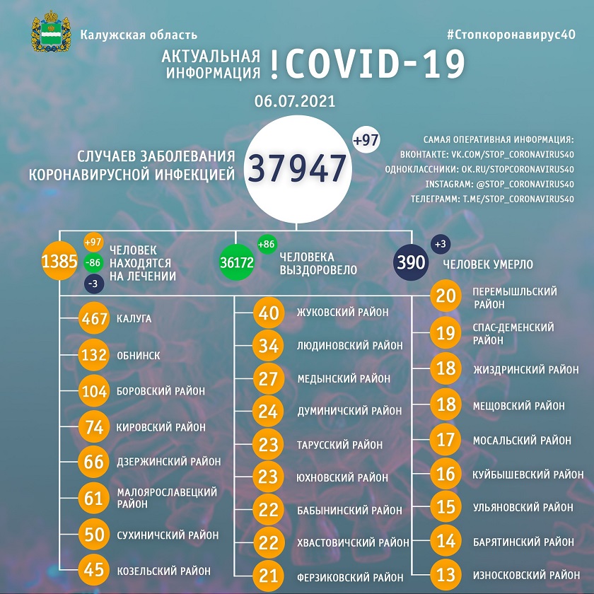 Оперативный штаб по распространению коронавируса в Калужской области опубликовал новые данные на 6 июля 2021 года.