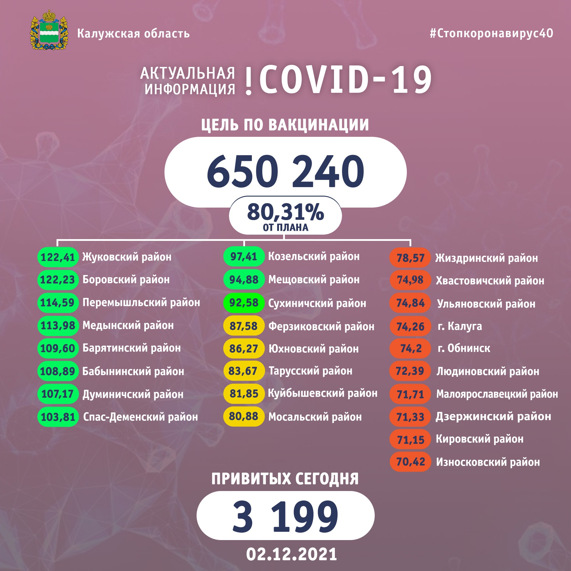 По данным министерства здравоохранения Калужской области, за четверг, 2 декабря, в регионе вакцинировались от коронавируса 3199 человек. Всего в регионе сделали прививку от инфекции 522 182 жителя области, что немного выше 80 процентов от плана.