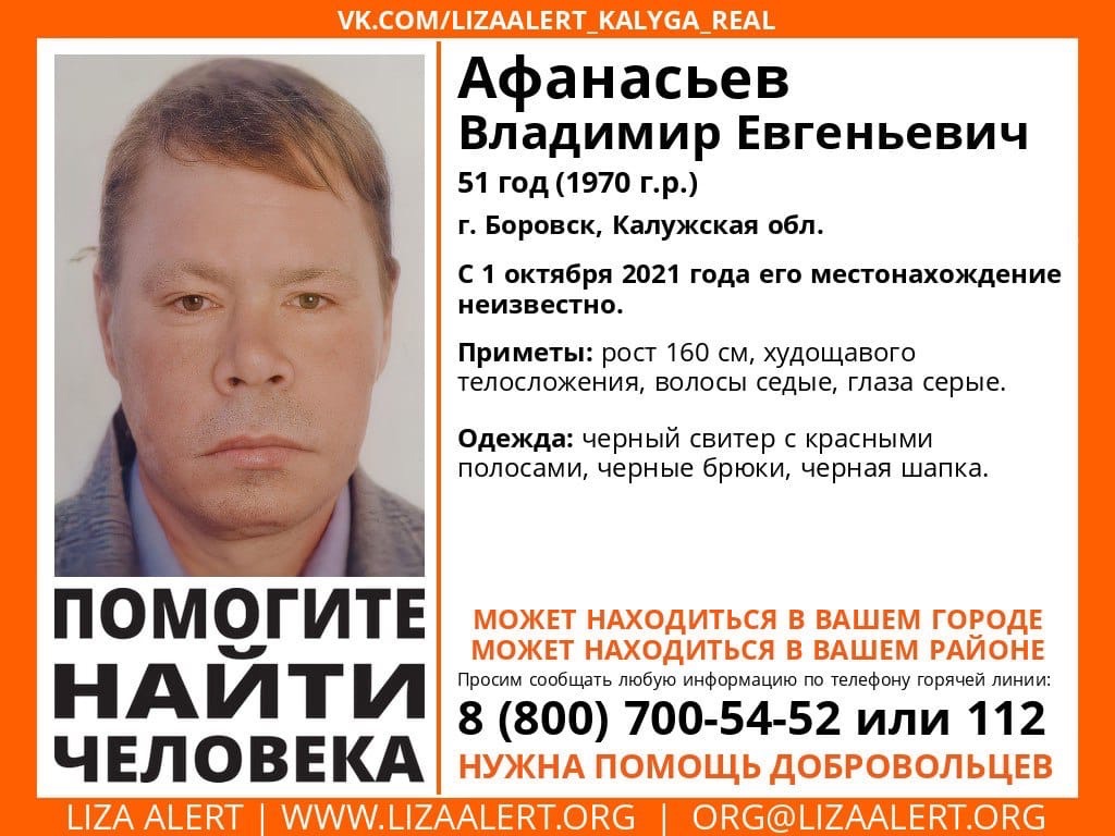 Пропавший из города Боровск в Калужской области. 1 октября мужчина ушел из дома, так и не вернулся. На странице поисково-спасательного отряда ВКонтакте опубликованы его приметы.