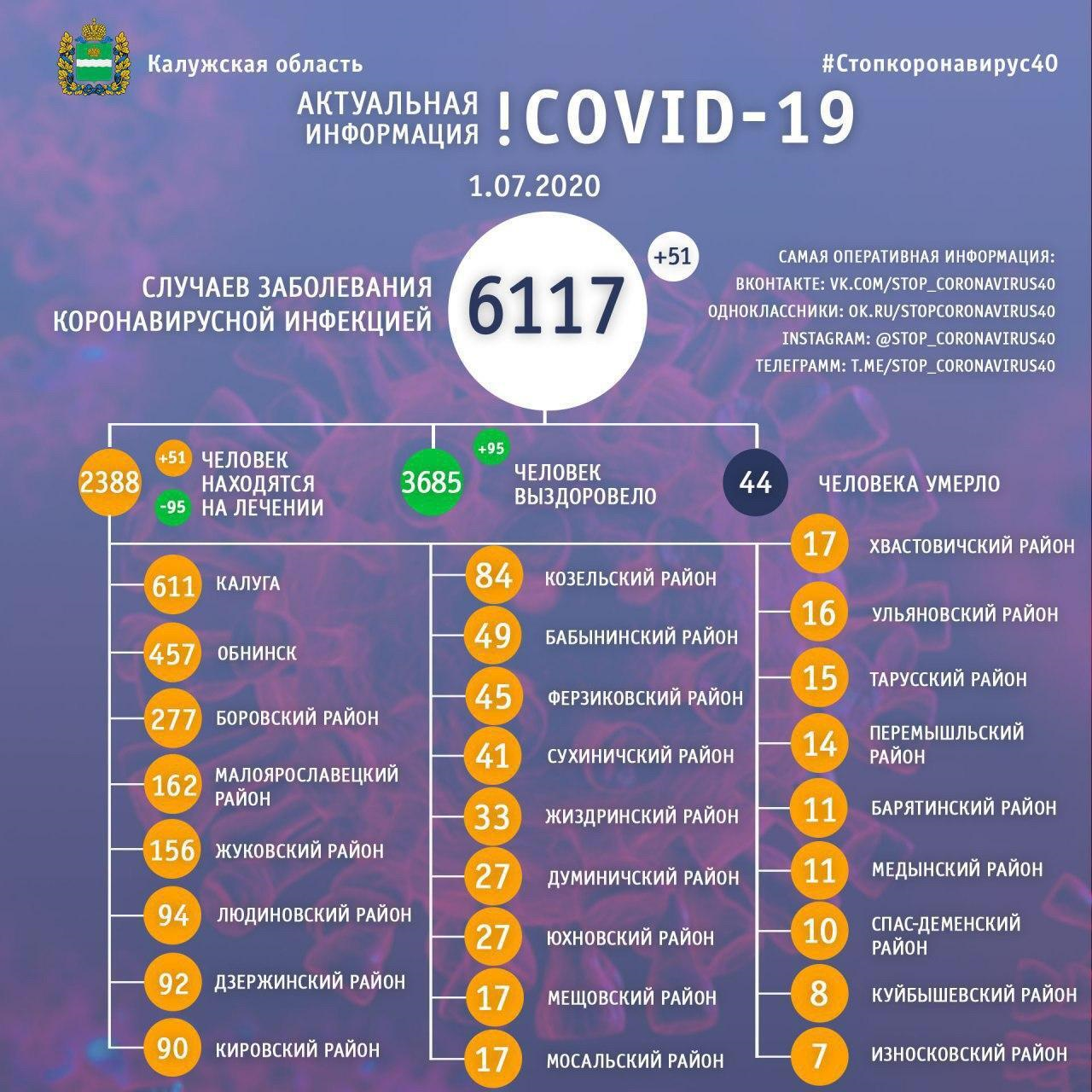 На сегодняшний день проведенные тесты подтвердили наличие новой коронавирусной инфекции у 6117 жителей области. 3685 из них успешно прошли лечение, сейчас они здоровы, в последние сутки врачи выписали 95 пациентов. В этот же новые проведенные исследования подтвердили диагноз у 51 калужанина. Они будут получать медицинскую помощь в больницах либо лечиться дома под наблюдением пациентов. Кстати, сейчас в области курс терапии проходят 2388 человек, инфицированных COVID-19. Большинство из них жители Калуги, Обнинска, Боровского, Малоярославецкого и Жуковского районов.