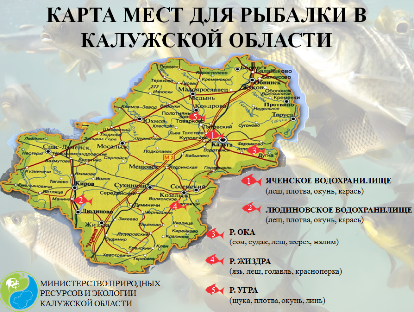Среди популярных общедоступных мест для рыбалки Людиновское водохранилище, реки Угра и Жиздра и другие малые реки области.
