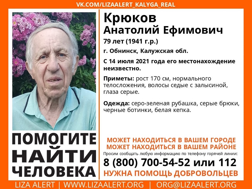 Анатолия Ефимовича Крюкова никто не видео со вчерашнего дня. Рост мужчины – 170 см, нормальное телосложение, седые с залысиной волосы, серые глаза. Одет Анатолий Ефимович был в серо-зеленую рубашку, серые брюки, черные ботинки и белую кепку.
