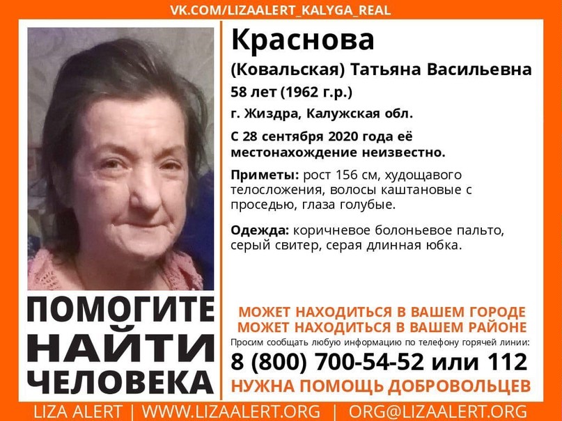 Как сообщает «Лиза Алерт», пропала Краснова (Ковальская) Татьяна Васильевна, 58 лет, г. Жиздра Калужской области. В последний раз ее видели 28 сентября.