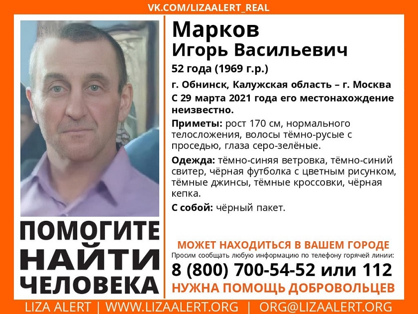 Когда мужчину видели в последний раз, на нем была темно-синяя ветровка, темно-синий свитер, джинсы и кроссовки темного цвета. С собой мужчина прихватил черный пакет.