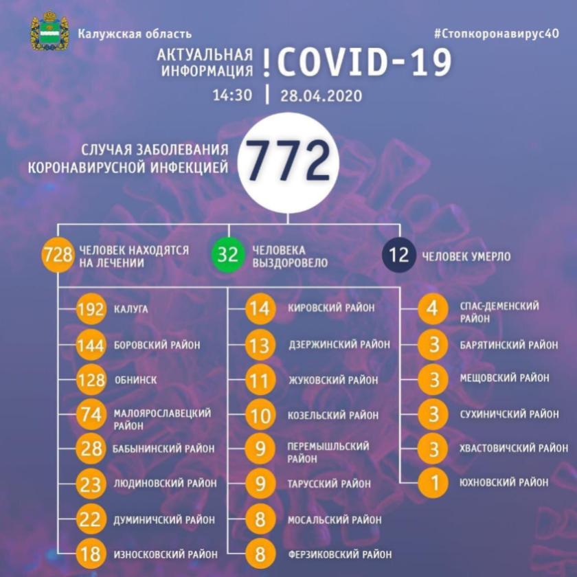 — По последним данным, в Калужской области 772 человека с подтвержденным диагнозом, 32 человека выздоровели, 12 — умерли, — написал руководитель области. — Возникло много вопросов о расхождении данных между федеральной статистикой и данными, которые я разместил сегодня утром в социальных сетях. Причина — в несвоевременном направлении информации министерством здравоохранения области о смерти пациентов с коронавирусной инфекцией в администрацию губернатора. Все меры по недопущению подобных ситуаций в дальнейшем будут приняты.