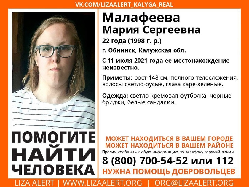 По информации отряда, местонахождение Марии Сергеевны Малафеевой неизвестно с 11 июля этого года. Рост девушки – 148 см, полное телосложение, светло-русые волосы, каре-зеленые глаза. Мария была одета в светло-кремовую футболку, черные бриджи и белые сандалии.