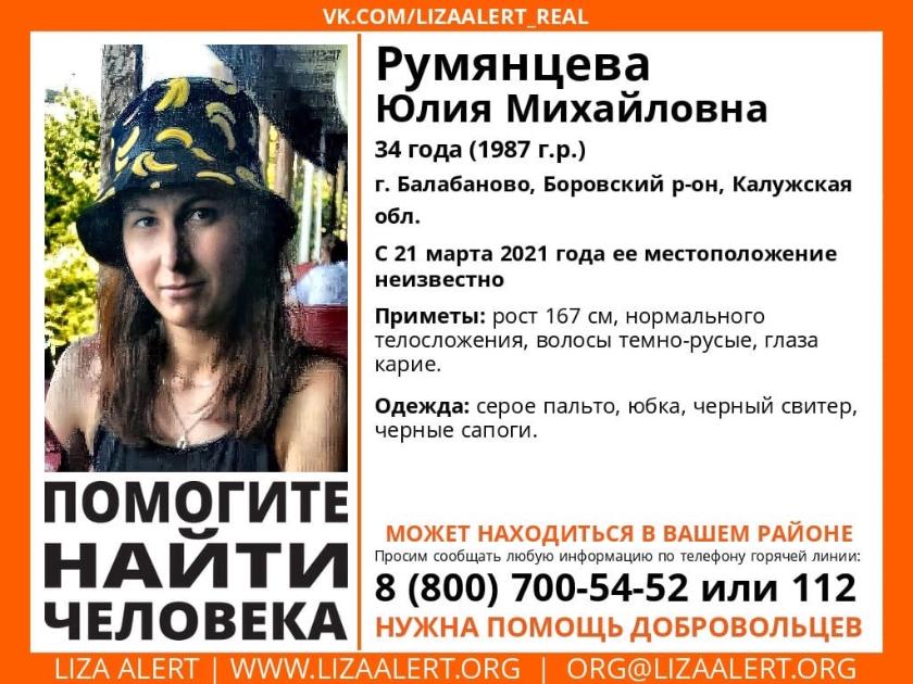 В Балабанове Боровского района Калужской области 21 марта пропала 34-летняя Юлия Румянцева.