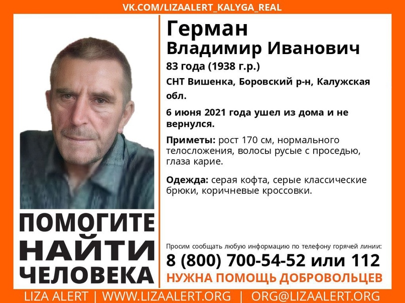 Владимир Иванович Герман пропал три дня назад около 17:00. Мужчина живет в СНТ Вишенка в Боровском районе. Спасатели просят калужан быть внимательными, а владельцев автомобилей, проезжающих в это время по трассам близ Балабанова, посмотреть записи с видеорегистраторов.