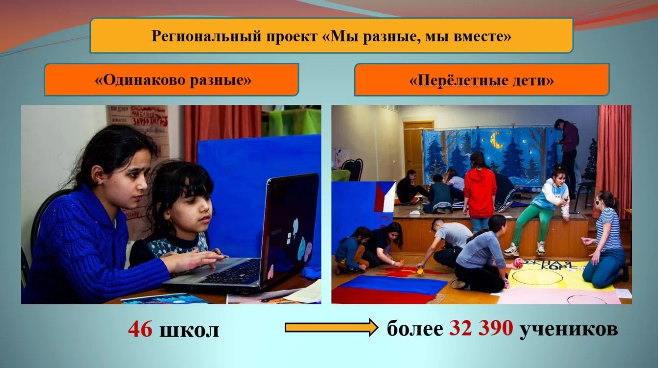 Особое внимание уделяется социальной адаптации детей мигрантов. На это направлен региональный проект «Мы разные, мы вместе». В нем участвуют 46 школ, в которых обучается большое количество детей, не владеющих русским языком. Общий охват составляет более 32 тысяч учеников.