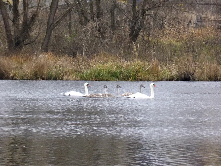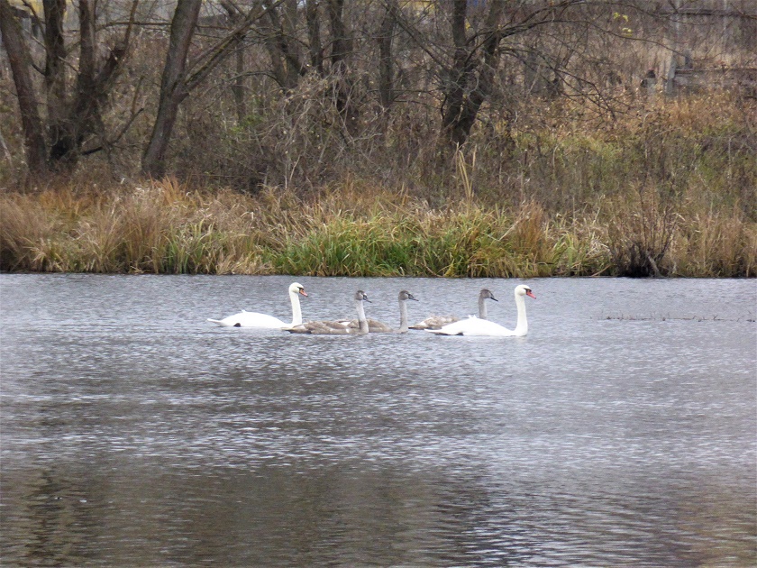 Вчера, 6 ноября, в Сухиничском, Жиздринском и Людиновском районах орнитолог заснял на свою камеру семью с 6 птенцами, три стаи с 3 птенцами, одну пару птиц без птенцов и лебедя-одиночку.