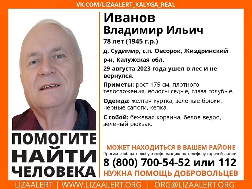 Мужчина голубоглазый и седой, плотного телосложения, рост – 175 сантиметров. Из дома ушел в кепке, желтой куртке, зеленых брюках и черных сапогах. При себе имеет зеленый рюкзак, белое ведро и бежевую корзину.