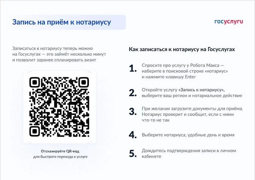 На запись к специалисту потребуется всего несколько минут. Сперва нужно зайти на портал «Госуслуги» под своей учётной записью и выбрать нужное нотариальное действие. Далее портал подскажет, какие документы потребуются для приёма. Затем нужно выбрать нотариуса, дату, время приёма и записаться. Само нотариальное действие оплачивается при приёме у нотариуса по установленным законом тарифам.
