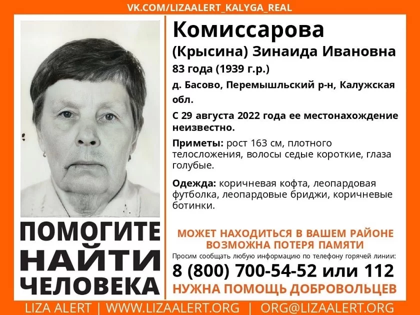 Пожилая женщина, проживающая в деревне Басово Перемышльского района Калужской области, ушла из дома 29 августа и до сих пор ее местонахождение неизвестно. Рост женщины 163 сантиметра, плотного телосложения, у нее короткие седые волосы, голубые глаза. Одета в коричневую кофту, леопардовую футболку и такого же цвета бриджи, обута в коричневые ботинки. Зинаида Ивановна могла потерять память.