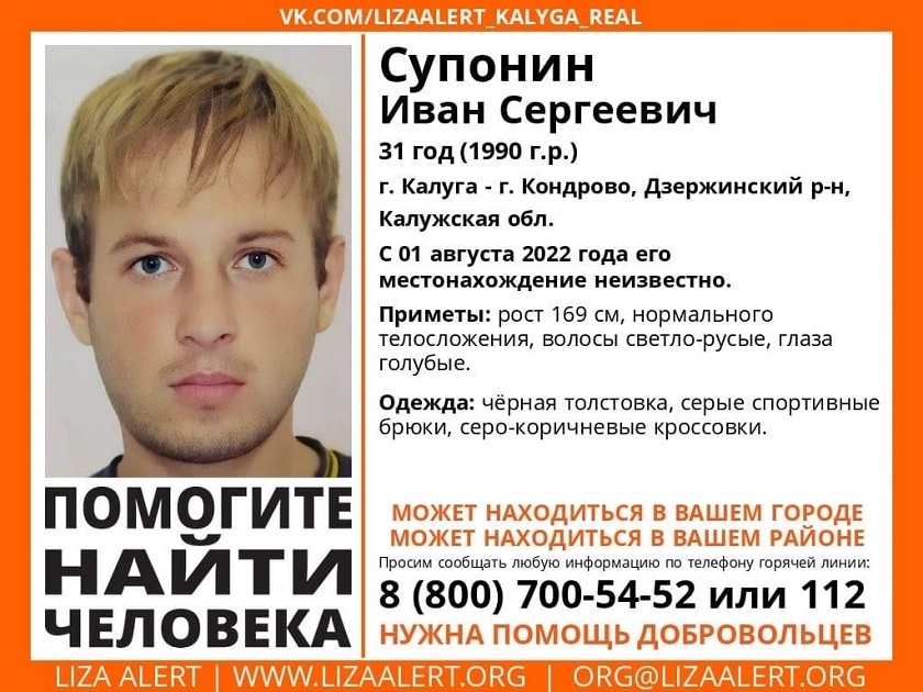 Как сообщается на странице сообщества "Вконтакте", 1 августа 2022 года Супонин Иван Сергеевич покинул свой дом, находящийся в Кондрове и с тех пор не выходит на связь. Его местонахождение неизвестно уже 16 дней. 31-летний молодой человек ростом 169 сантиметров, нормального телосложения, волосы светло-русые, глаза голубые. В последний раз его видели в черной толстовке, серых спортивных брюках и серо-коричневых кроссовках.