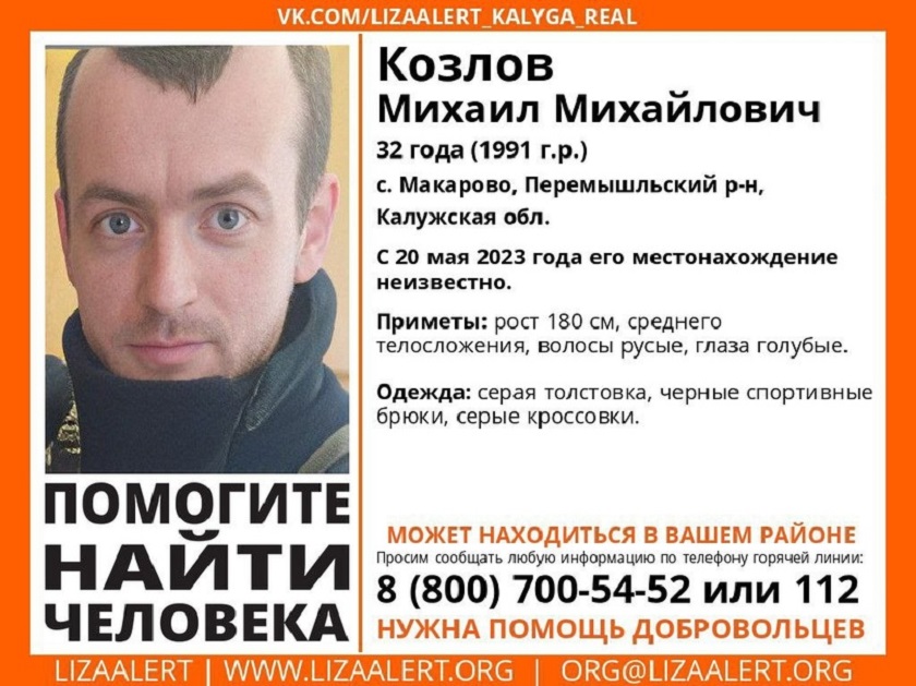 Поисково-спасательный отряд «ЛизаАлерт» просит помощи в поисках Михаила Михайловича Козлова. Мужчина ростом 180 см, среднего телосложения, с русыми короткострижеными волосами и голубыми глазами. В последний раз его видели в серой толстовке и такого же цвета кроссовках, а также в черных спортивных брюках.