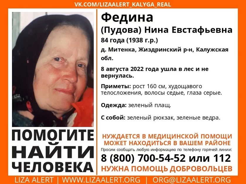 По сообщению поисковиков, Нина Евстафьевна, проживающая в деревне Митенка Жиздринского района, ушла в лес 8 августа 2022 года и не вернулась. Женщина покинула дом в зелëном плаще, имеет при себе рюкзак и вёдра того же цвета. Местная жительница невысокого роста – 160 сантиметров, имеет худощавое телосложение, седые волосы и серые глаза. Сотрудники поисково-спасательного отряда просят о содействии в поисках. Каждый, кто обладает какой-либо полезной информацией о местонахождении пожилой женщины может обратиться по телефону горячей линии (8 800 700-54-52) или по телефону 112. Пенсионерка может нуждаться в медицинской помощи.