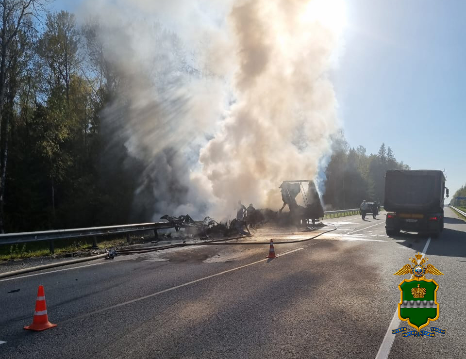 ДТП произошло в Юхновском районе сегодня, 27 сентября, в 15:14. На 225 километре трассы А-130 фура Daf, ехавшая из Москвы по направлению к Рославлю, выехала на встречную полосу и столкнулась с Renault. В результате легковушку откинуло на обочину, где автомобиль загорелся. Грузовик также загорелся, протаранив ограждение и выехав в кювет.