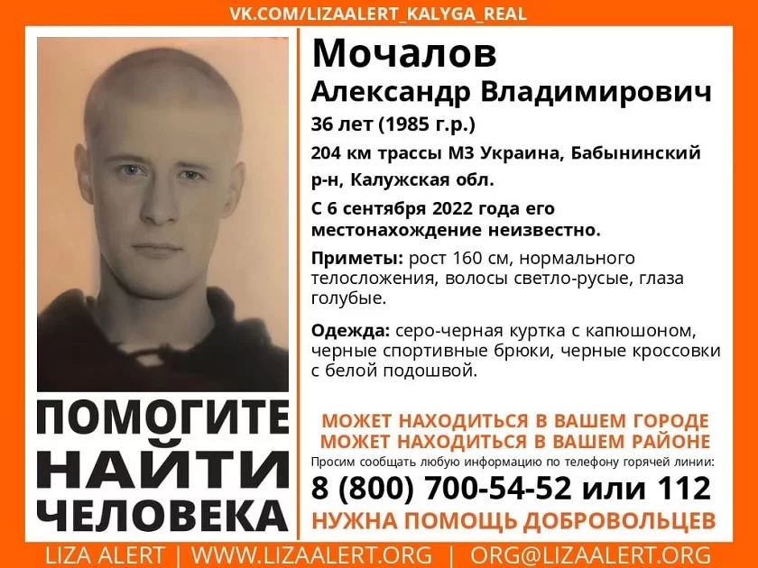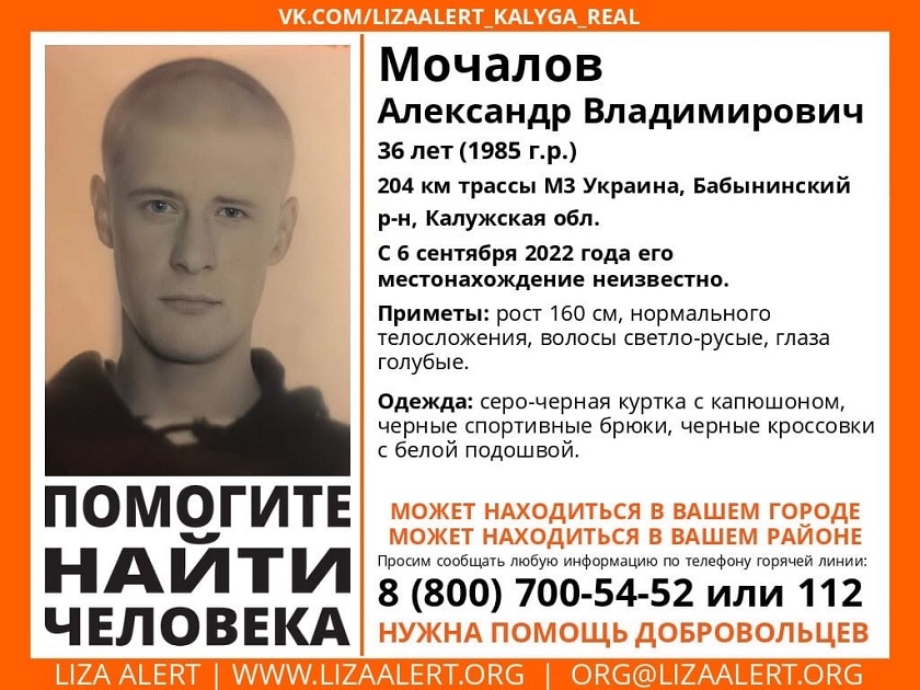 36-летний местный житель пропал на 204-м километре трассы МЗ Украина в Бабынинском районе 6 сентября. До сих пор местонахождение мужчины неизвестно. У него следующие приметы: рост 160 сантиметров, нормальное телосложение, светло-русые волосы, голубые глаза. В последний раз его видели в серо-черной куртке с капюшоном, черных спортивных брюках и черных кроссовках с белой подошвой.