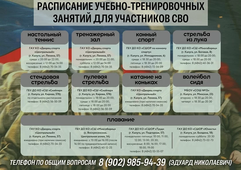Во всех спортивных школах региона предоставляется бесплатное посещение физкультурно-оздоровительных секций для ветеранов и участников СВО. Члены их семей получают 50% скидку в соответствии с локальными нормативными актами. Например, бассейн Дворца спорта «Центральный» в Калуге участник СВО и его дети до 18 лет могут посещать бесплатно.