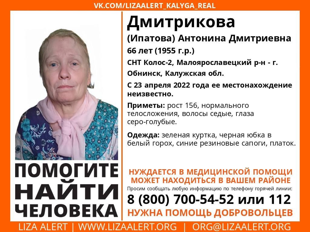 Антонина Дмитриевна Дмитрикова (Ипатова) ушла из дома 23 апреля и с тех пор ее местоположение родственникам неизвестно. По словам волонтеров-поисковиков, пропавшая, возможно, может находится в СНТ Колос-2 Малоярославецкого района или в Обнинске.