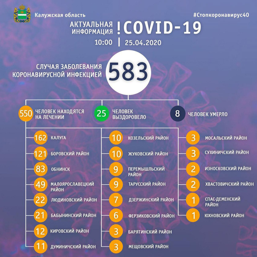 По данным на 10.00 субботы, 25 апреля, в региона на лечении находятся 550 человек. Выздоровели 25. Напомним, что вчера вечером их было только 17.