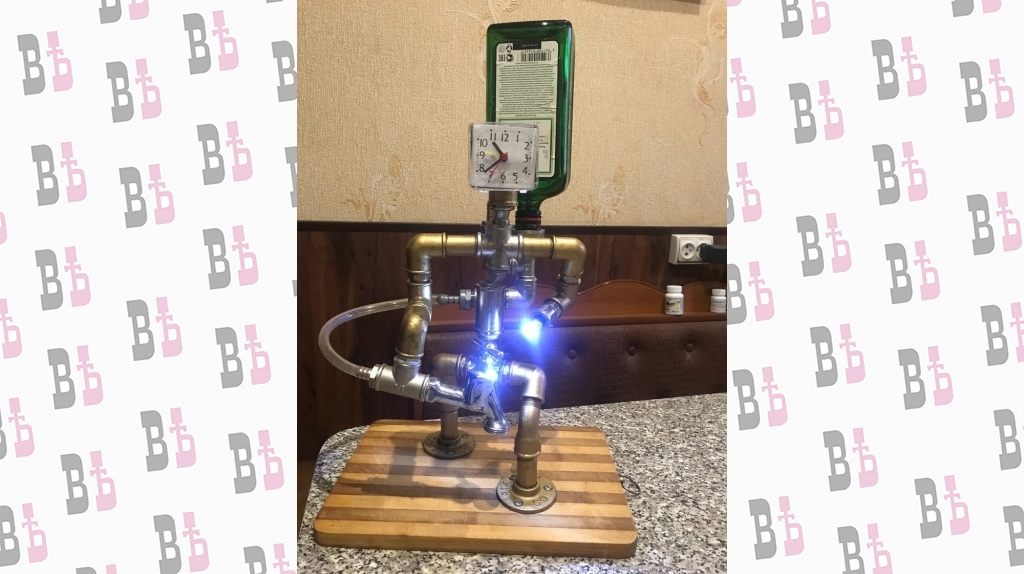 Житель Воротынска продает собственное изобретение – робота, созданного из водопроводных труб и деревянной разделочной доски. Его предназначение – разливать крепкие спиртные напитки с помощью краника и будильника, который возвышается над конструкцией. Для этого к «наливатору» вверх ногами прикручивается бутылка спиртного и содержимое по трубам наливается в рюмку.
