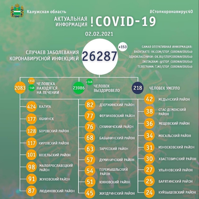 Выздоровело за все время 23 986 человек. Из них за последние сутки болезнь побороли 148 жителей Калужской области.