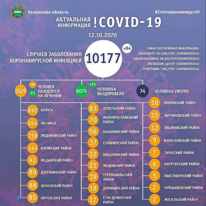 По данным на вечер 12 октября известно, что в регионе с начала пандемии заболели ковидом 10177 калужан. Речь идет о людях с подтверждённым диагнозом. В последние сутки вирус обнаружен у 94 человек. Важно, что практически 80% заболевших уже поправились. Еще 2029 пациентов проходят лечение от COVID-19. Часть из них принимает препараты дома, люди с осложнениями проходят курс терапии в инфекционных отделениях области.