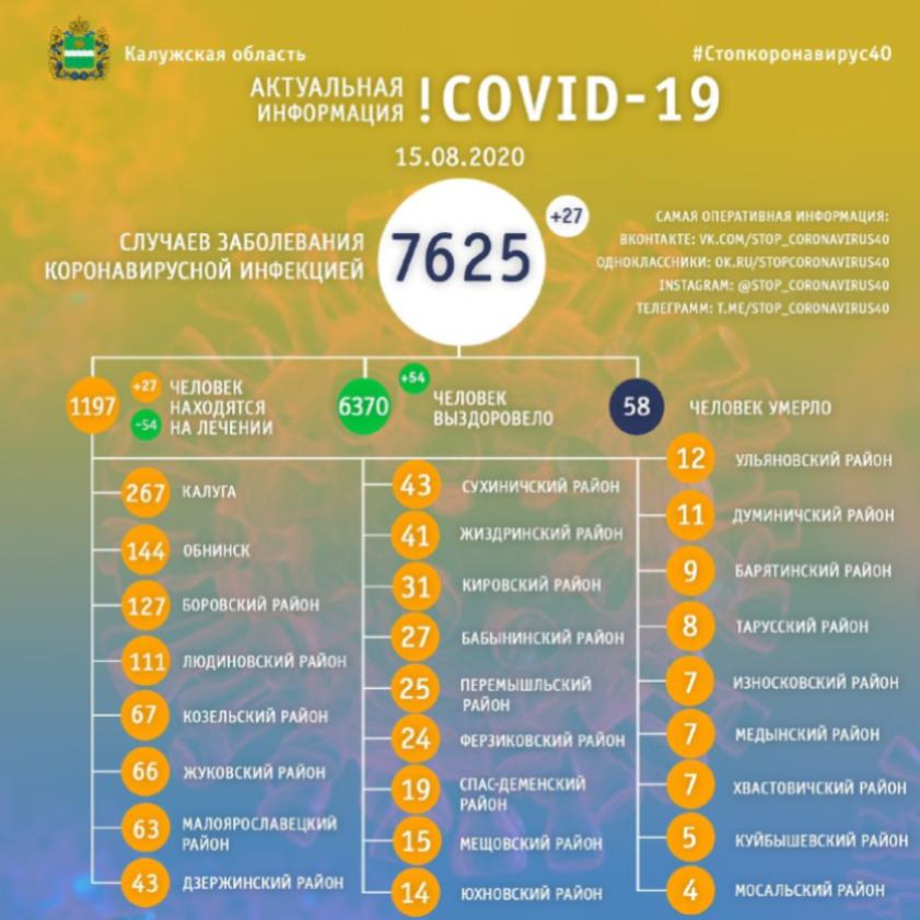 Также в сообщении указанно, что за сутки в Калужской области выявили еще 27 случаев заболевания коронавирусной инфекцией. Всего в регионе 7625 подтвержденных случаев заболевания.