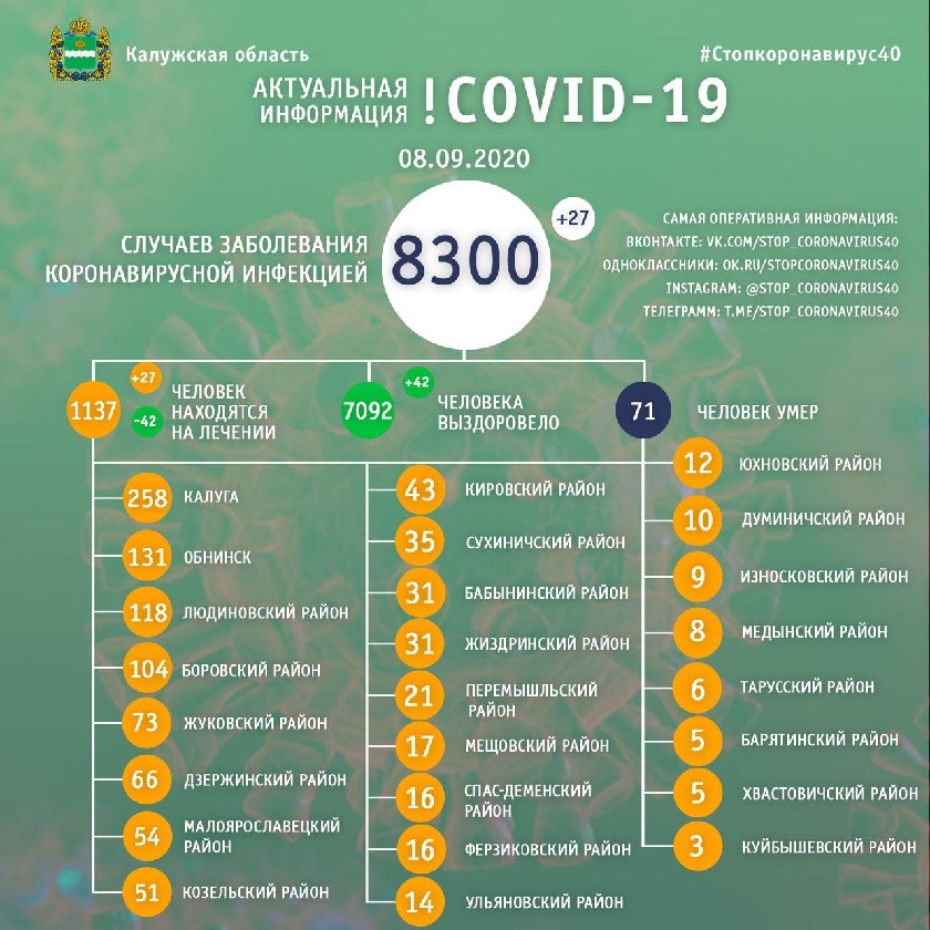Заболевших коронавирусом за последние сутки в Калуге прибавилось на 27 человек. Теперь их общее количество составляет 8300.