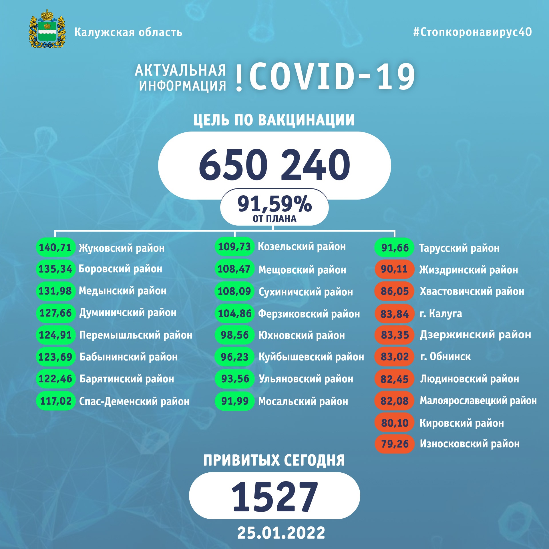Как сообщило министерство здравоохранения Калужской области на официальном аккаунте в соцсетях, по состоянию на 25 января в регионе вакцинировались от ковида 595 561 житель. За сутки прививку от коронавируса сделали 1527 человек. Общий уровень вакцинации достиг 91,59 процента от плана.