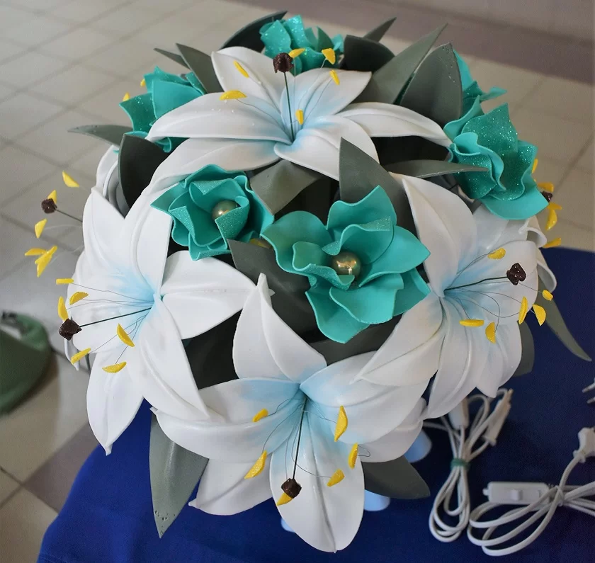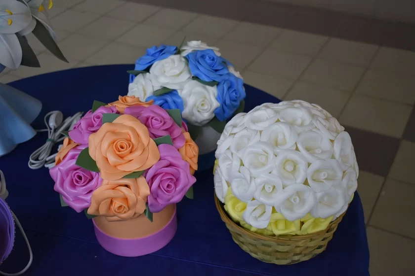 Автор выставки рассказала, что увлеклась искусством изготовления светильников четыре года назад, во время декретного отпуска. С тех пор её навыки в этом ремесле вышли на высокий уровень – Елена делает не только прикроватные лампы в виде букетов, кукол, животных и птиц, она научилась изготавливать и масштабные скульптурные композиции – её огромные букеты в половину человеческого роста не раз украшали сцену ДК «Юбилейный», где сейчас работает Елена. На выставке также был представлен торшер около двух метров в высоту с бутонами-светильниками.