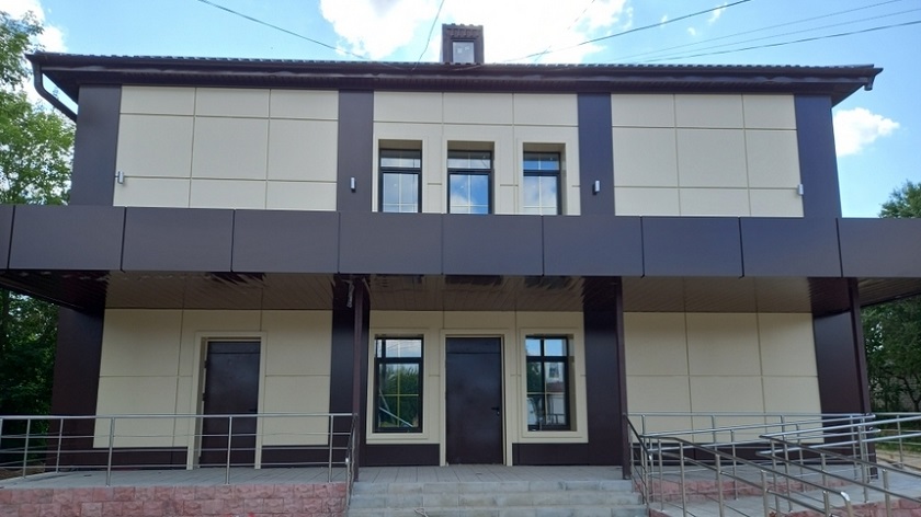 На сегодняшний день завершено устройство входной группы, ведется облицовка стен фасадными плитами. Одновременно продолжаются внутренние отделочные работы.