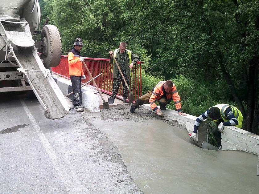 С левого берега по течению Хатожки бетон залили в специальные металлические ячейки, увеличивающие прочность и предохраняющие от размывов. Параллельно восстанавливаются и желоба, по которым отводится вода с моста, - часть из них пришла в негодность.