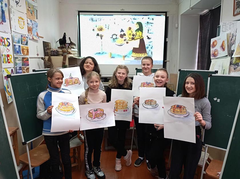 Атрибуты масленицы - круглые, румяные, блины, символизирующие яркое солнце, также учились рисовать. Под руководством преподавателя Анны Жариковой ребята из 1 -4 классов приняли участие в Весёлом скетче, «Масленичные блины», выполнив быстрые, красочные и «вкусные» зарисовки блинов акварелью. Юные художники с удовольствием приобщились к модной и популярной техникой рисования, зарядившись позитивной энергией на целую «масленичную неделю».