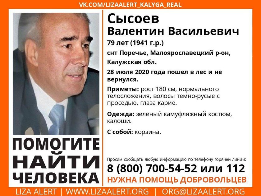 Приметы: рост 180 см., нормальное телосложение, темно-русые с проседью волосы, карие глаза. В тот день, когда уходил в лес, на нем были одеты зеленый камуфляжный костюм и калоши. С собой была корзина.