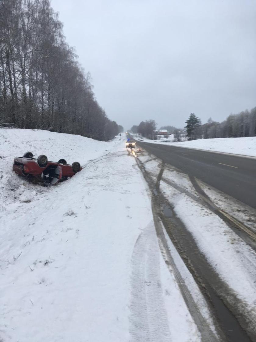 Как сообщает калужская Госавтоинспекция, 50-летний водитель отечественной легковушки в снегопад неправильно выбрал скорость движения и не учел дорожные и метеорологические условия. Лада Гранта двигалась со стороны г. Рославля в сторону г. Москвы, на припорошенной снегом дороге водитель потерял контроль за движением транспортного средства, машина съехала с трассы и перевернулась.