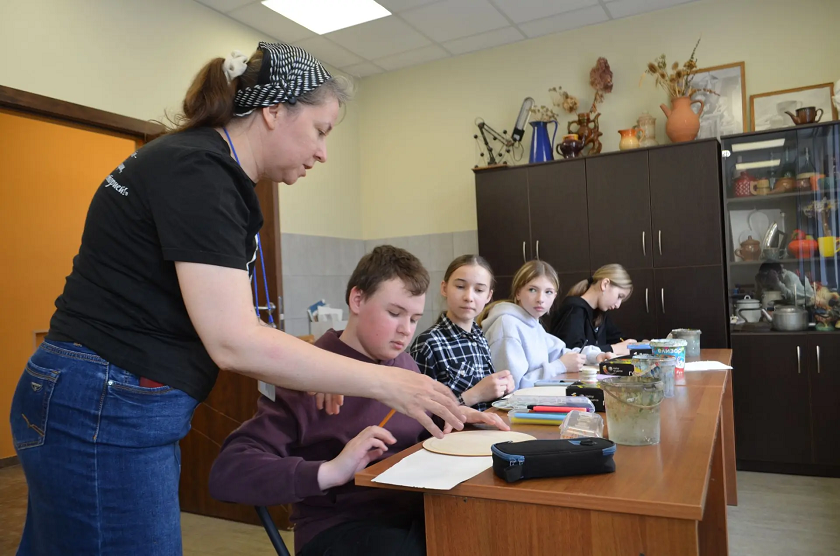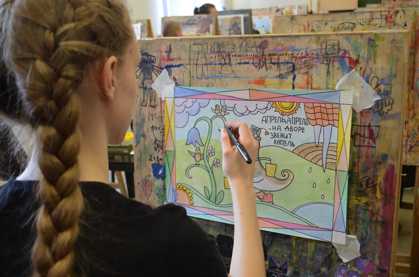 Школьники за три часа написали картину на тему «Апрель, апрель- на дворе звенит капель» в стиле русского лубка.