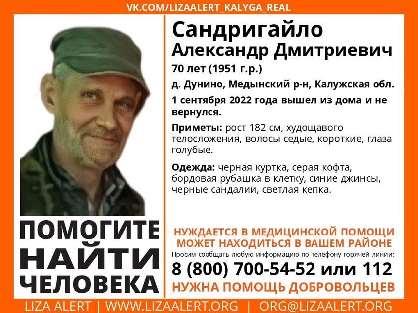 Водителей, направлявшихся в город Медынь 1 и 2 сентября, поисково-спасательный отряд просит вспомнить – не видели ли они или не подвозили по дороге высокого худощавого пожилого человека, а также владельцев видеорегистраторов просят проверить свою технику. Ко всем, кто имеет информацию, убедительная просьба обратиться по телефону горячей линии: 8-800-700-54-52 или 112.