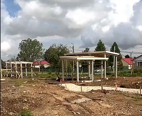Строители работают над обустройством тротуаров и навесом для детской площадки. В парке возведут открытую террасу и здание для туристко-информационного центра. Появятся фонтан, сцена, места для отдыха.