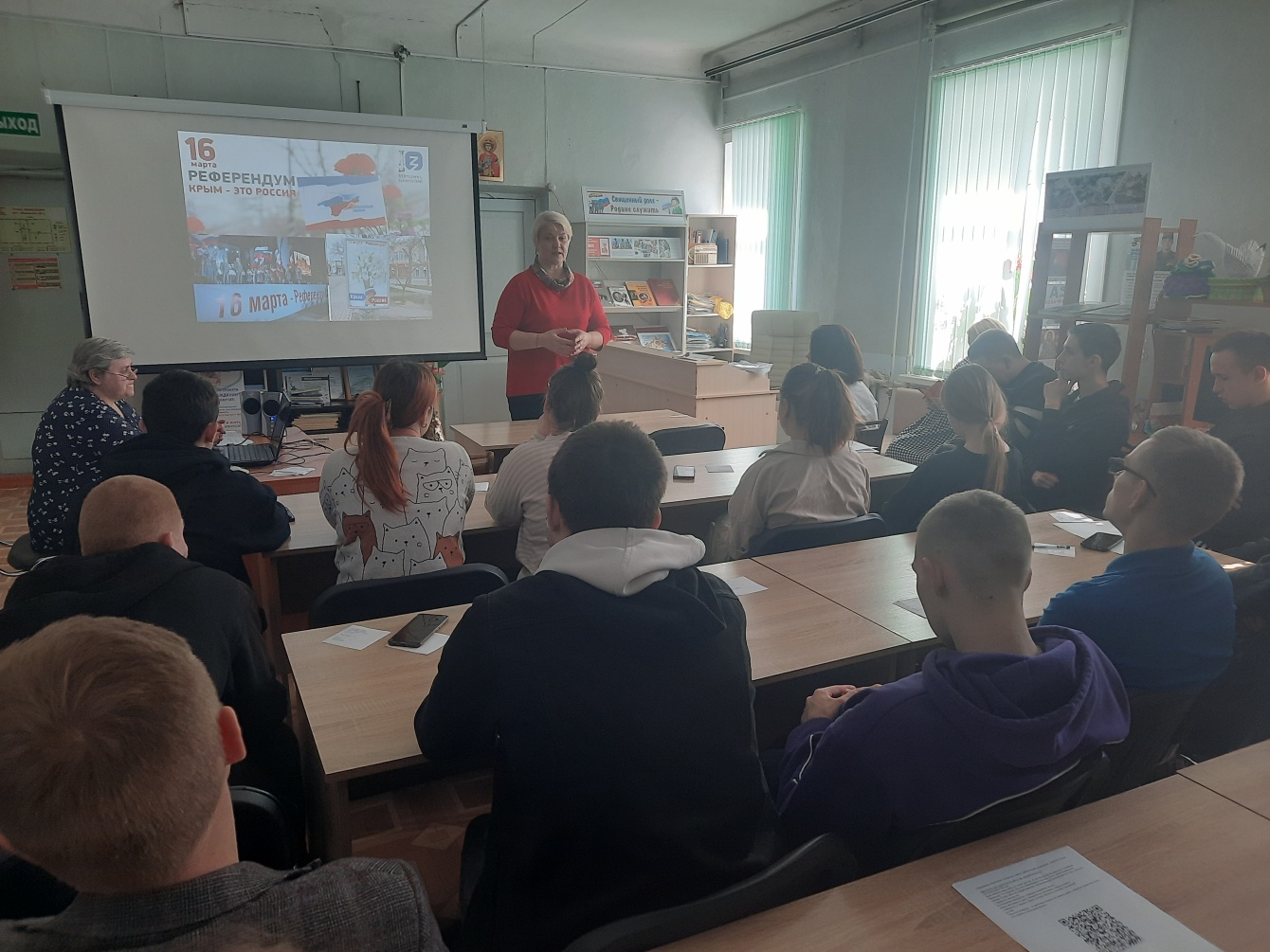 Работники библиотеки Людмила Вдовкина и Наталья Щербо рассказали об исторических событиях, ставших причиной воссоединения Крыма с Россией, о межгосударственном договоре, о принятии Крыма и Севастополя в состав России и об итогах проведенного в марте 2014 года референдума в Крыму.