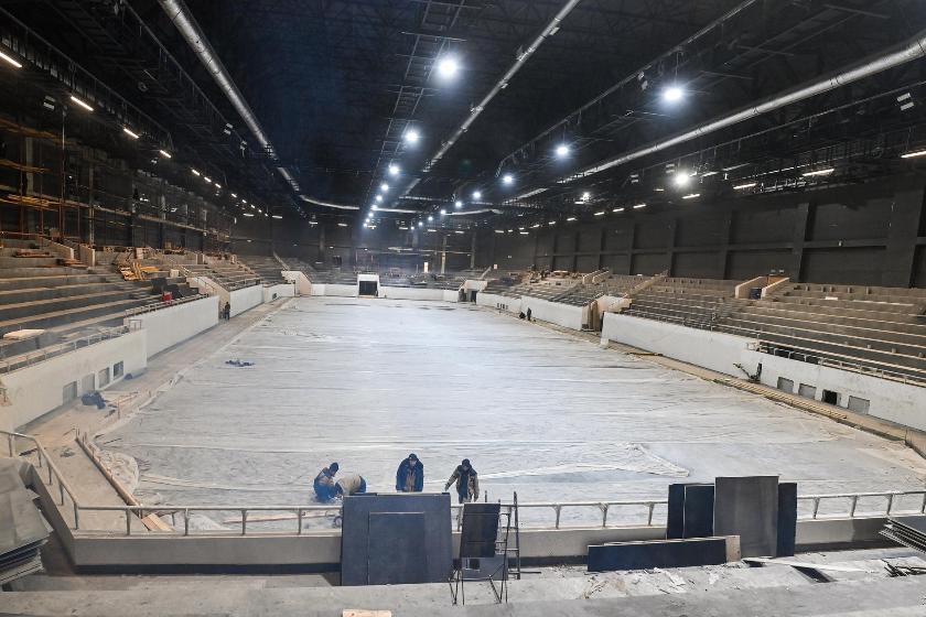 Сейчас строители завершают отделку фасадов Дворца спорта, в водном комплексе уложена плитка, ведется отделка трибун. В универсальном игровом зале готово основание под спортивный паркет, на его укладку уйдет еще три недели.