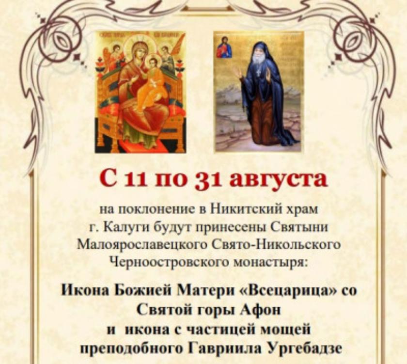 Завтра, 11 августа, на поклонение в Никитский храм Калуги будут принесены Святыни Малоярославецкого Свято-Никольского Черноостровского монастыря: Икона Божией Матери «Всецарица» со Святой горы Афон и икона с частицей мощей преподобного Гавриила Ургебадзе.