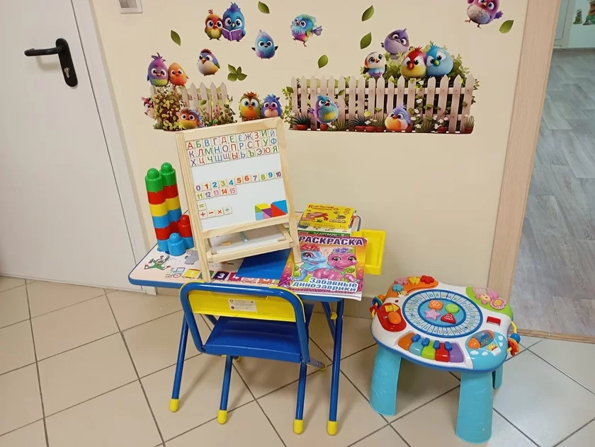 Больница была отремонтирована, любовно украшена и оборудована так, чтобы маленькие пациенты чувствовали себя комфортно. Безусловно, и родителям даже краткосрочное пребывание в Центре с ребенком стало намного удобнее. Есть где переодеть малыша и сменить ему подгузник, где покормить его. Совсем маленьких можно на некоторое время оставить в манеже с игрушками. А дети побольше найдут занятия по душе за рисовальным столиком, в мини-библиотеке, или смогут посмотреть мультфильмы.