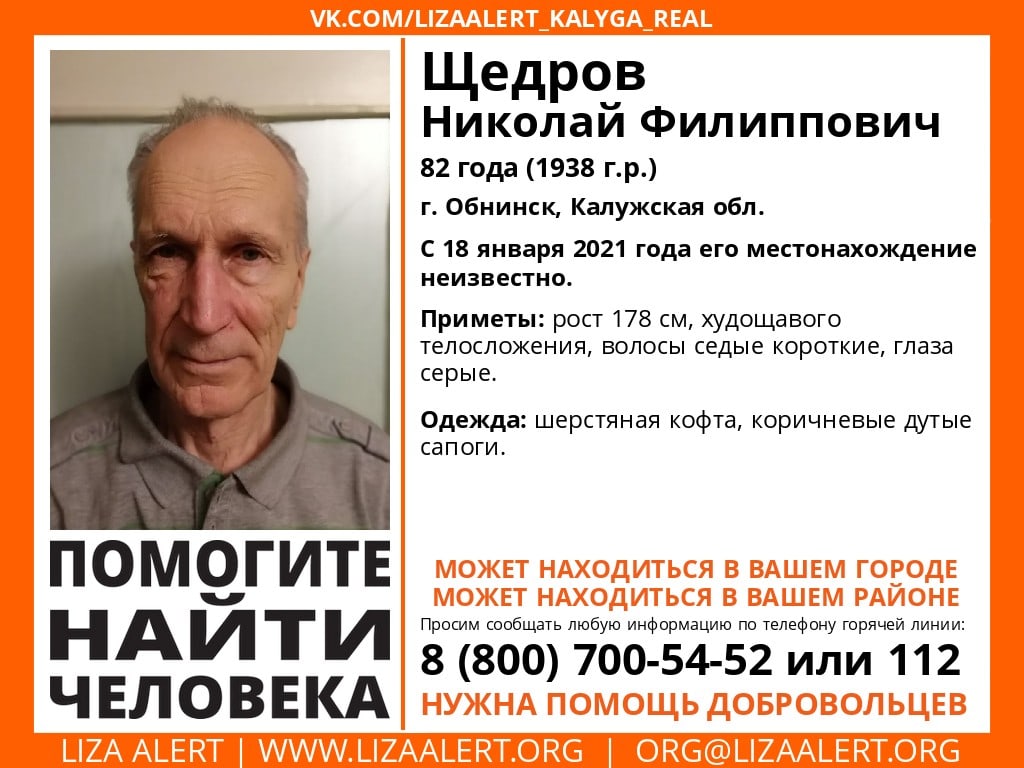 По информации отряда, в понедельник, 18 января, пропал 82-летний Николай Филиппович Щедров. С понедельника ничего не известно о его местонахождении.