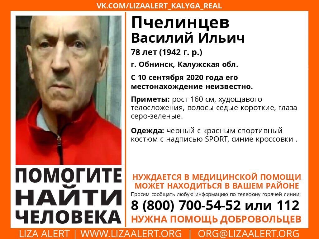 В Обнинске спасательный отряд «Лиза Алерт» разыскивает пропашего мужчину. Василий Ильич Пчелинцев, 78 лет. Последний раз его видели 10 сентября. С тех пор родным ничего не известно о его местонахождении.