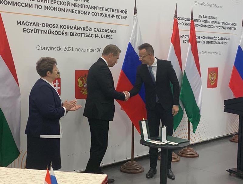Позднее министр внешнеэкономических связей и иностранных дел Венгрии в Обнинске вручил министру здравоохранения РФ Михаилу Мурашко командорский крест Венгрии.