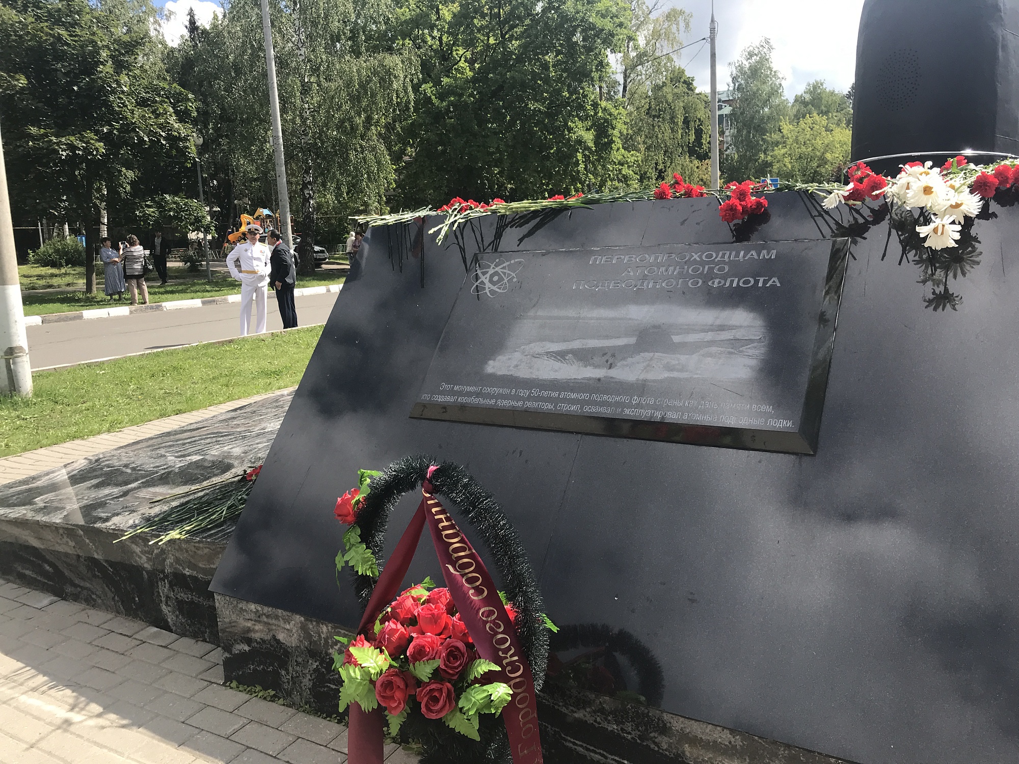 Участники митинга возложили цветы к памятнику первопроходцам атомного подводного флота.