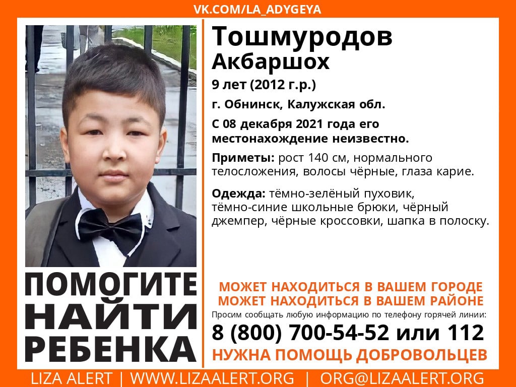Поисковый отряд «ЛизаАлерт» сообщил о поисках 9-летнего Акбаршоха Тошмуродова. Мальчик пропал в Обнинске Калужской области. Последний раз его видели 8 декабря. С тех пор его местонахождение неизвестно.